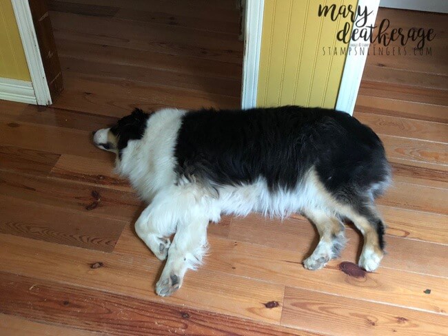 Great birthday card Mary! That’s a stamp set I don’t have, another one to add to the list. Well I’m going to say that pan must have tasted really good for Finn to have chewed on like it was one of his chew toys, silly boy! Glad he is ok and has a quick thinking Mom around! Be still my heart 🙂
